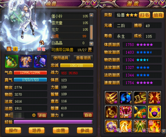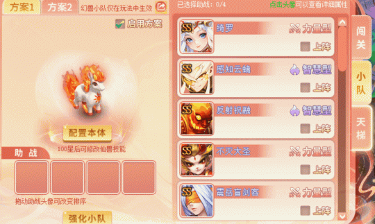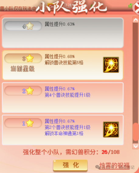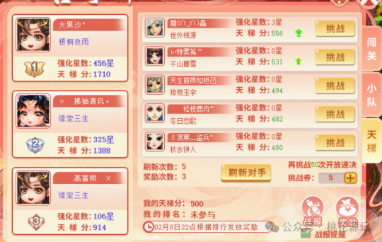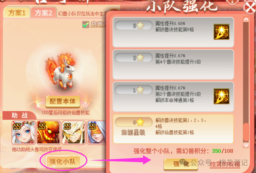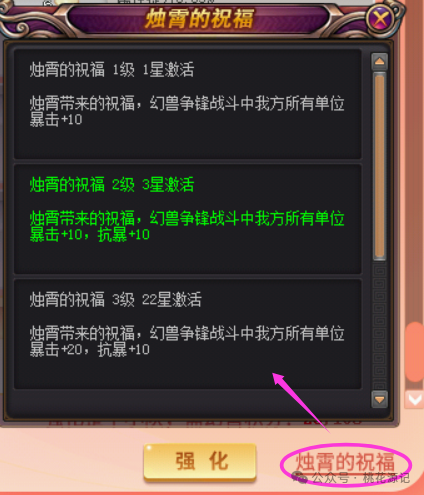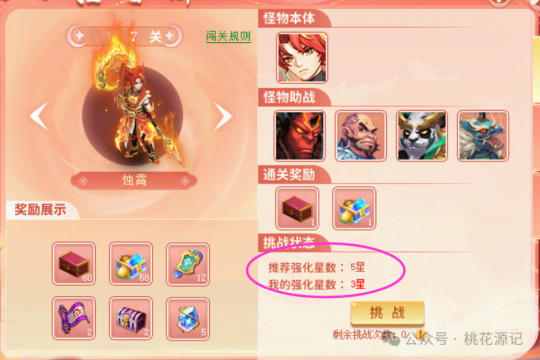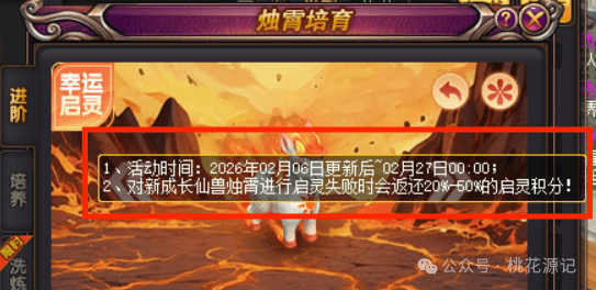 桃友们晚上好鸭! 在这次的更新中,我们迎来了全新成长型仙兽-烛霄,同时幻兽争锋,天梯挑战也限时返场啦!这次的天梯玩法,和之前绮罗战记版本又有了不少变化哦! 接下来,就让我们一起深入了解这只兼具群体与单体的新仙兽,以及幻兽争锋的具体活动玩法吧~ 技能简介 和绮罗一样,除了仙兽技能,还多一个本命技能。仙兽技能是升阶自动升级,本命技能是通过洗练升级。 攻击方面 赤焰斩(群体):一次打3个目标,每个都造成 120% 的物理伤害。 焚野击(单体):集火一个目标打2下,每下造成 75% 的物理伤害。 技能联动 这两个技能可以互相触发,形成连招: 使用赤焰斩后 → 主目标气血高于50% → 触发无消耗(不消耗真气)焚野击(也就是单体打目标2下) 使用焚野击后 → 主目标气血高于50% → 触发赤焰斩(群3个目标) 增伤机制 对同一个主目标,每攻击2次,伤害就+10%最多叠到+30%(也就是打6次后满层)不管用赤焰斩还是焚野击,只要释放后主目标气血还高于 50%,就会触发额外效果,也就是一回合打主目标3次,这样能快速叠满30%的伤害加成。 这里还有转移目标清零,就是一旦你换目标了(比如从目标1换成目标2),那所有增伤立刻就没有了,需要重新开始叠加。 总之,集中火力打一个目标,伤害会越来越高!不要随意切换目标。 克制一次攻击里有多段伤害的攻击,但,不是所有伤害都减,而是“每受到第2次伤害”时才触发减免。 比如:战魂的游龙斩技能,一次打3段伤害 第1段 → 正常伤害 第2段 → 减伤60%(因为是“第二次受伤”) 第3段 → 正常伤害(因为是新一轮的“第一次”) 总之,精准针对版本主流的多段输出技能。适配性超广,比如降雪,因为降雪的第二段伤害正好在减伤60%上面,很大可能是打不出第3段攻击了~,天君的biubiu、血公子、秘法神道、昊天等热门多段技能,全能被针对,直接大幅降低对方爆发伤害! 现在的对局大多会清宝宝,面对遍地的多段输出,这个就是刚需级存在,60%的减伤在对抗多段伤害时坦度飙升,再也不用怕被一套秒掉~ 这个启灵技能直接是加伤害的效果,可以说是适配所有单体物理输出宝宝,无论是主动攻击宝宝还是普攻宝宝。特别是血公子,魔尊,不敢想再加上这技能,那伤害~~ 培育流程 同样分为:进阶—洗练—培养。 一、进阶 焰霄宝藏:用金子或体验券积分玩,抽取焰霄令。 烛火寻幽:用焰霄令寻宝获得进阶道具(寻宝次数),洗练道具(金霄石和紫霄石),培养道具(鎏金石) 点获取资源进入烛火寻幽,获得进阶材料。焰霄宝藏则是能获取烛火寻幽这里次数的。 这是赠送的10次寻宝机会,可直接将仙兽升至二阶。 该仙兽的进阶机制与其他成长型仙兽类似,但寻宝次数更多。在累计寻宝达到 10 / 60 / 90 / 150 / 1200 次时,会分别赠送进阶道具用于升阶。整只仙兽共 6阶,除去赠送的10次还需1500次寻宝才能满阶。 每天活跃度达到100可免费获得1次寻宝,若有小月卡,还能额外再送1次。按每天稳定获取2次来计算,到6阶大约需要2年!! 注意的是,启灵技能有使用限制!必须达到6阶后才能激活。因此,对有需求的玩家来说,速成几乎是必选项。 这只仙兽的寻宝次数虽有增加,但对应的抽取道具数量也同步提升了,实际价格和原来差距不大 二、洗练 洗练同样是获取烛宵后限时14天,但是本次搭配了幻兽争锋活动,如果你第一天就打开了礼包,那么最多时限是可以21天的。 只有限时期间才能获得洗练道具,洗练时间过后清空剩余的洗练道具。 洗练包括,洗出其他三星技能(不包括珍稀三星仙兽)和稀有超级,而且还可能洗出本命技能(火焱盾)。 本命技能初始是1级。最高能升到10级,每个等级影响技能减伤强度 三、培养 就是自由加点,你需要啥属性就优先培养哪个。 最好先考虑好做什么仙兽后,最后成品了再加点,避免中途想换个仙兽发现分配的属性不匹配。重置是需要金子的。 幻兽争锋 搭配小队 本体的配置需要自己去选技能来搭配。图下↓ 这里选择你的本体宝宝类型,然后选择技能,符文,仙兽技能,本命,启灵技能。图下↓ 搭配好本体宝宝后,再选择助战的4只宝宝。 然后再去强化小队。 小队强化 搭配好的小队技能不会一开始就全部生效,需要通过幻兽积分强化来逐步解锁。而且技能是按你排序的先后顺序来解锁和升级的,所以一定要把核心技能排在最前面。我这里350点积分,点了强化后就会点亮星,生效对应的技能。 强化星提升后,属性是整个小队同步变强,不只是单个本体仙兽。强化到特定等级时,还能解锁烛霄的祝福,这个全队被动技能。 那么这个强化积分,也就是幻兽积分哪里来呢? 是通过获取鎏金石获得积分的,系统送10次。我们用这10次来抽奖就可以获得部分积分、 闯关挑战 闯关挑战前先小队界面搭配好本体和4个助战,才能进入关卡挑战。 没达到推荐星数,觉得你的队伍强度不够,就会给怪开挂,比如推荐5星你只有3星,怪就会变得更强,打你更疼,让你赢的可能几乎变没。 每天保底5次挑战,你强化星数越多,能打的次数就越多,但当天不用完的挑战次数会第二天清零,如果没幻兽积分强化的也是可以每天挑战5次,就是没有道具奖励,只有一点经验。 天梯挑战 就是一个每3天一轮的PK赛。先搭配好自己的幻兽小队并强化,然后用每天免费给的5张挑战券去挑战其他玩家,赢了加分、输了扣分,积分越高排名越靠前。每一轮结束时会根据排名发奖励。 如果你打满50场,还能解锁“速决”功能,直